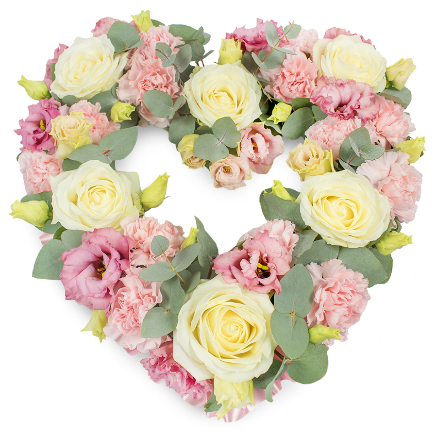 Our Serene White Heart Flower Bouquet is a timeless tribute, elegantly combining white roses, soft pink carnations, delicate pink lisianthus, and lush eucalyptus leaves. This arrangement is thoughtfully designed to symbolize love and remembrance.